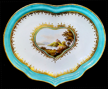 ![]() 37R Derby rare heart shaped dish painted with a view of 'On the River Trent' under two gilt borders and a turquoise border c. 1785-93 Crown, batons 'D' in black Cond: wear to central gilding Price: According to John Twittchet, black marked pieces are very rare and were made for export. |