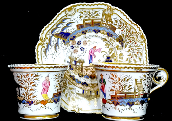 ![]() 19-R Barr Worcester miniature trio painted with gilt vines and brown leaves 3.5 ins. D. (saucer) Cond: Excellent Incised and impressed marks £350 |