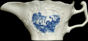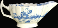 ![]() WB14 Worcester sauceboat with high sides painted with the Man with a Bomb pattern c. 1765-68 |