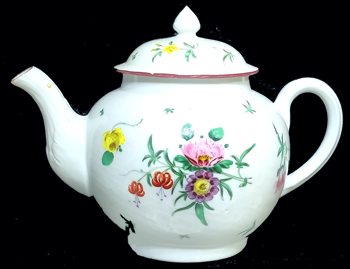 To give you an idea how much is on the website: Bow 66 pieces Plymouth-Bristol 2 pieces Caughley 55 pieces Chelsea 35 pieces Derby 45 pieces Liverpool 19 pieces Longton Hall 8 pieces Lowestoft 7 pieces Vauxhall 20 pieces Worcester-blue 60 pieces Worcester-Coloured 24 pieces Worcester-transfer 21 pieces 19th & 20th century British European under construction |